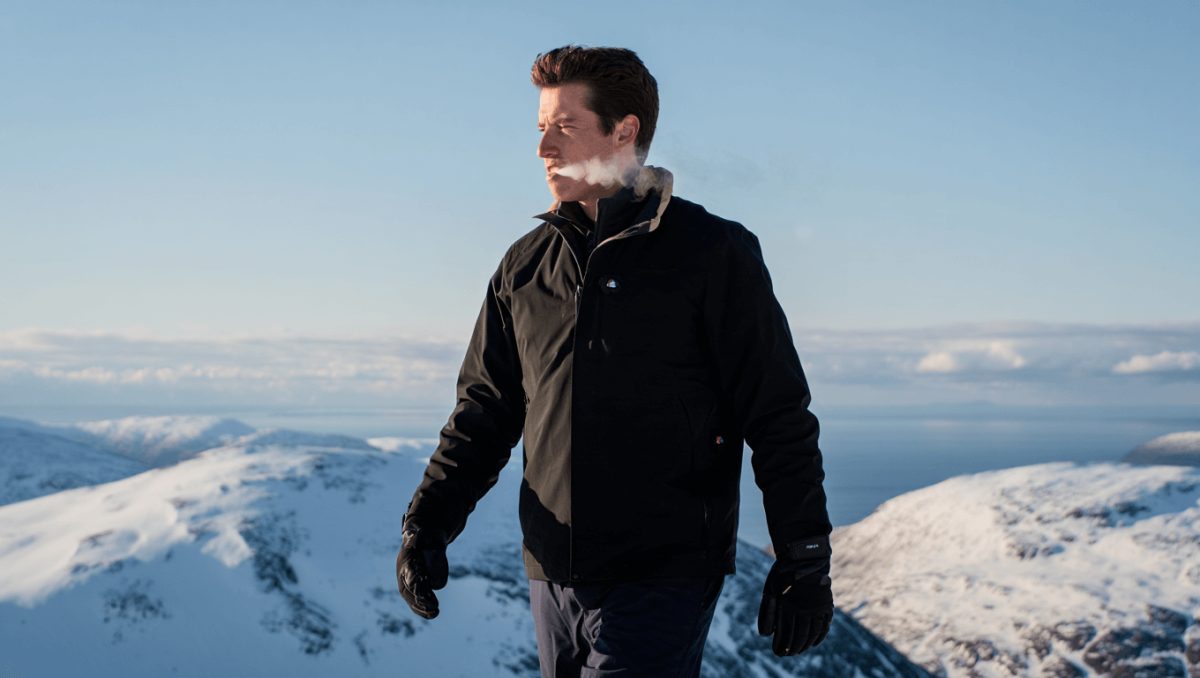 - White jacket against a stark winter sky.